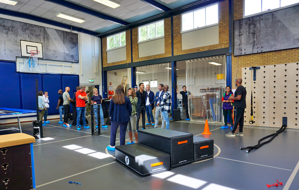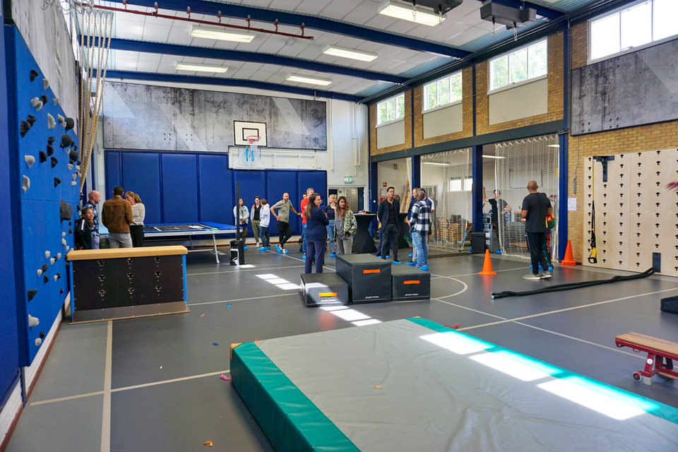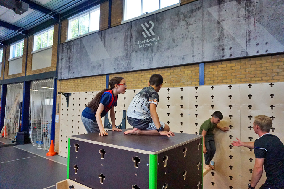 In april 2022 openden de deuren van onze Urban Sports Gymzaal, de derde showcase die we opleverden. Bij een showcase proberen we innovatieve producten en concepten uit om vervolgens te beoordelen in hoeverre ze geschikt zijn om toe te passen in andere gymzalen. De Urban Sports Gymzaal is een gymzaal die naast de gewone gymlessen ook geschikt is voor urban sports als freerunnen, bootcamp en crossfit. Wat er anders is? De wall jumper, een trampoline op de wand, bijvoorbeeld. En de cubewand zorgt ervoor dat een sportaanbieder elementen in de wand kan klikken. Extra obstakels voor freerunnen of een circuit voor bootcamp bijvoorbeeld.